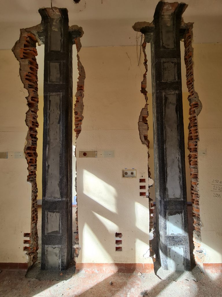Padiglione 13: miglioramento sismico su fabbricato in a telaio in c.a. con rinforzo solai, creazione piano rigido, rinforzo travi e pilastri n FRP, creazione di nuovi corpi scale esterni.